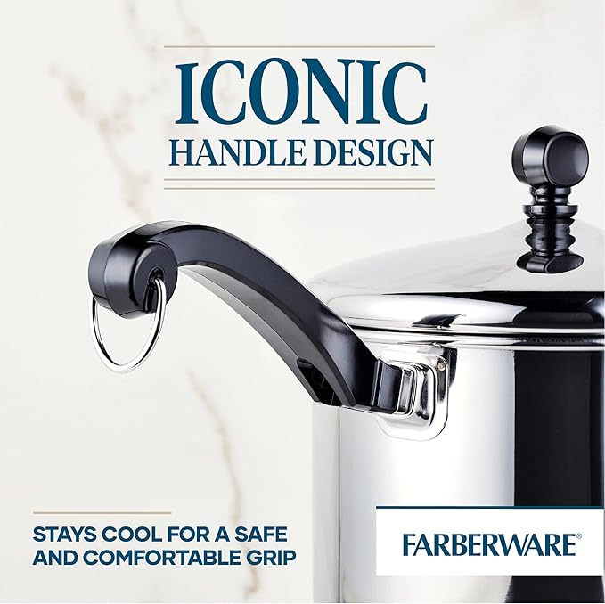 - DURABLE CONSTRUCTION, COMFORTABLE DESIGN: Comfortable handle with iconic styling provides a confident grasp; stainless steel, snug-fitting lid boasts bell shape, rolled rim and stylish knob