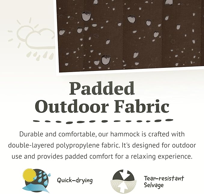 - Designed for care-free relaxation: a resilient fabric with tearproof edges. Our fast drying, outdoor material is resistant to sun and water damage. Plus it’s machine washable, so you can rest easy. Spreader bar made of sustainable, FSC certified wood.