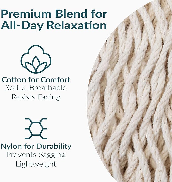 - SOFT YET STRONG HANDWOVEN CRAFTSMANSHIP: Made from 80% cotton and 20% nylon, this Mayan hammock combines softness with lasting strength. Each piece of the rope hammock is handwoven with thick cotton cord, giving it a supportive yet breathable structure built to endure daily use.