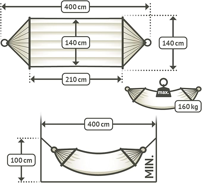 - Bed width: 4 ft 7 in / Bed length: 6 ft 11 in / Total length: 13 ft 1 in / Length of the bar: 4 ft 7 in / Required minimum distance: 13 ft 1 in / Material description: 100% polypropylene | suspension and filling: 100% polyester | ring: steel | spreader bar: pine (FSC certified)