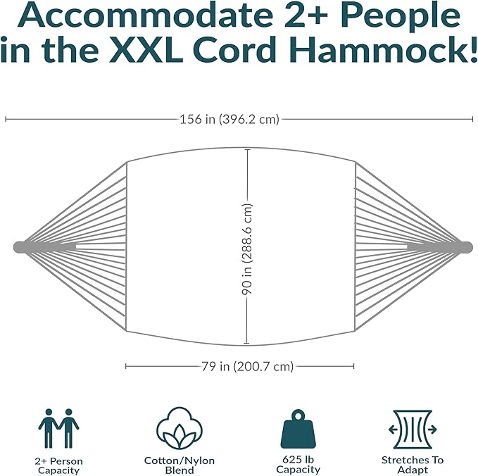 - SPACIOUS COMFORT FOR 2 OR MORE: Measuring 156" W x 90" D, this extra-large patio hammock easily accommodates one, two, or even the whole family with a weight capacity of 625 lbs. The oversized hammock bed area (79" W x 90" D) offers plenty of room to stretch out, nap, or lounge in total ease.