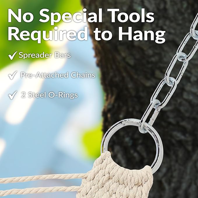- EASY TO SET UP ANYWHERE: The rope hammock for backyard includes pre-attached chains with 2 steel O-rings so no special tools are required. It can be hung up between trees, poles, or on a hammock stand (not included).