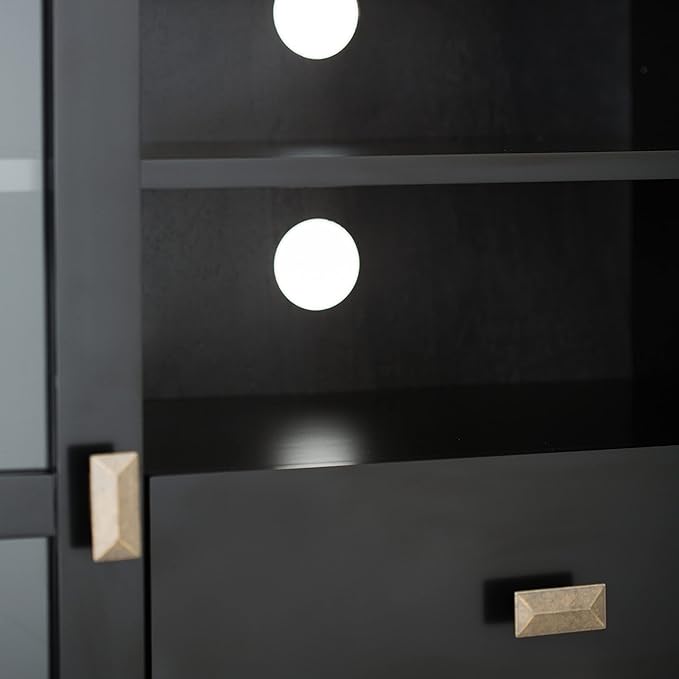 - Features two (2) central drawers with metal glides, open center area with adjustable shelf and two (2) side tempered glass framed doors that open to large storage spaces with two (2) shelves each
