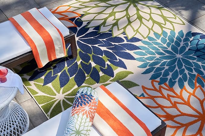 - This indoor and outdoor rug has solid and outlined lotus patterns in navy, blue, orange, and green.Product Note : Rugs may contain temporary creases upon arrival, allow time for creases to flatten and settle