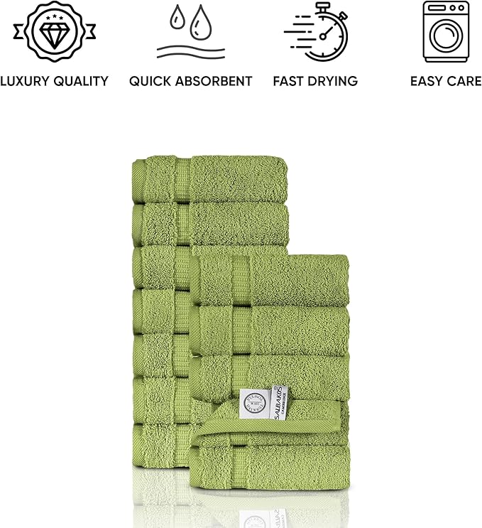 SALBAKOS 100% Turkish Cotton Washcloth Set of 12 13x13 inch | Heirloom Quality | Hotel & Spa Collection | Ultra Soft, Super Absorbent, Washcloth Towels | Made in Turkey (Green, 12 Washcloths)