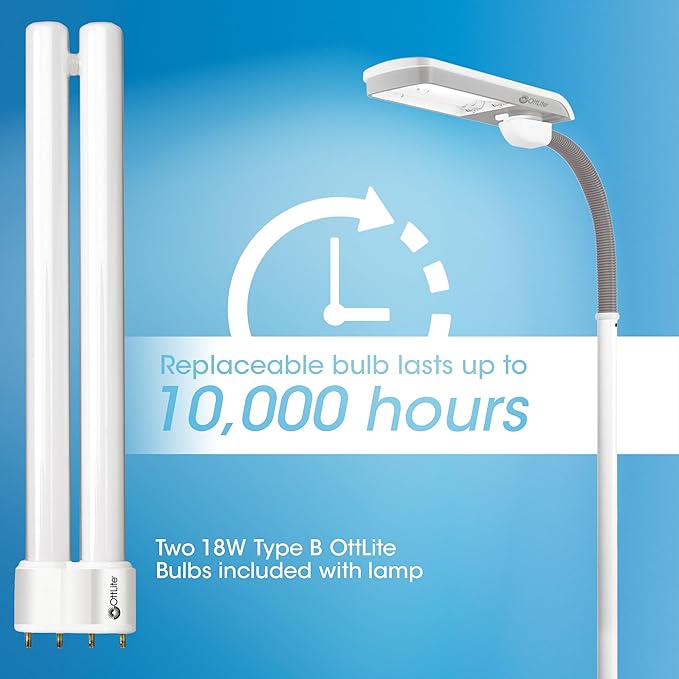 - Long-Lasting Light: This lamp includes two genuine OttLite 18-Watt Type B bulbs, for a total of 36-Watts of power. These bulbs are replaceable, but you won’t have to worry about that for a while — they last up to 10,000 hours.