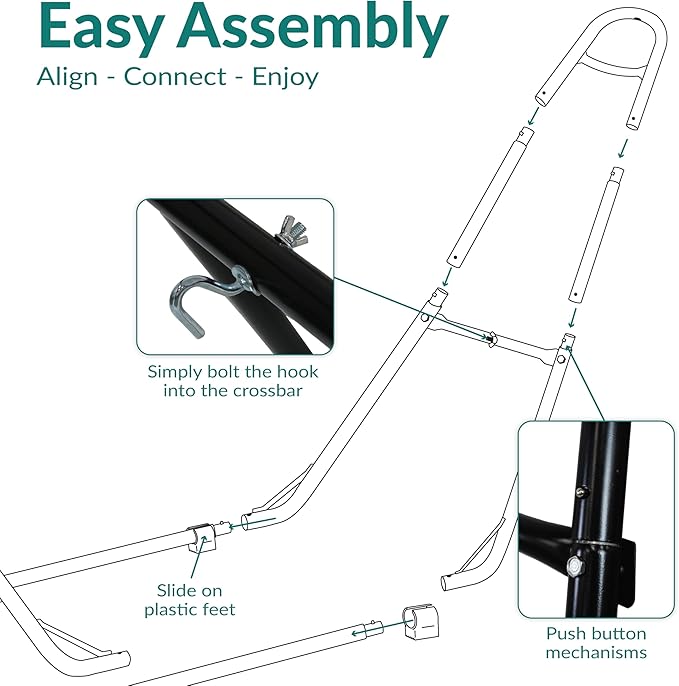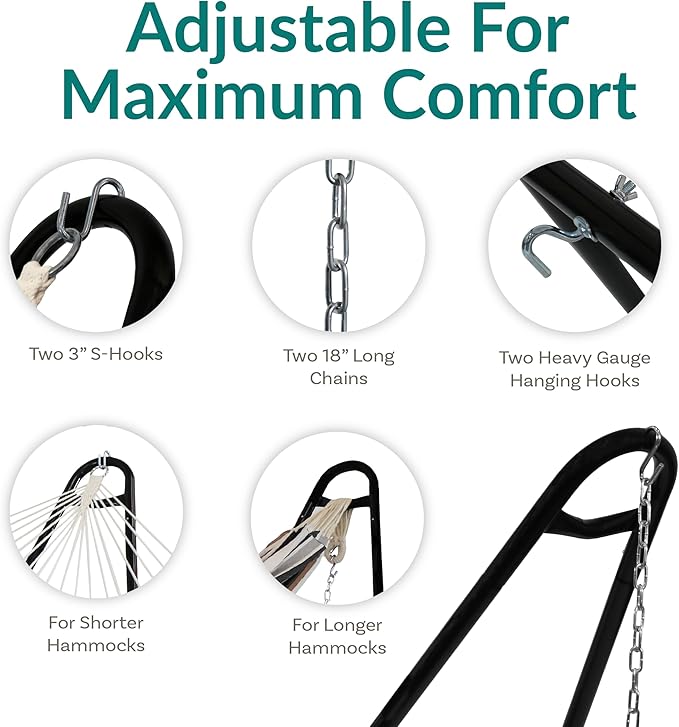 - EASY TO PUT TOGETHER: This outdoor hammock stand includes two 3" S-hooks, 2 heavy-gauge hanging hooks, 4 plastic feet, and two 18" chains to make it easily adjustable to any desired length. Assembly is easy and requires no special tools. All joints lock together with easy spring-snap button mechanisms.