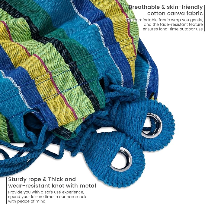 - Hammock is made of durable canvas for years of worry free enjoyment, the polyester stuffing head pillow add more comfort for laying on this hammock with stand set.