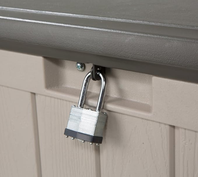 - Extra-large deck box made from high-density polyethylene (HDPE) plastic, powder-coated steel hinges
