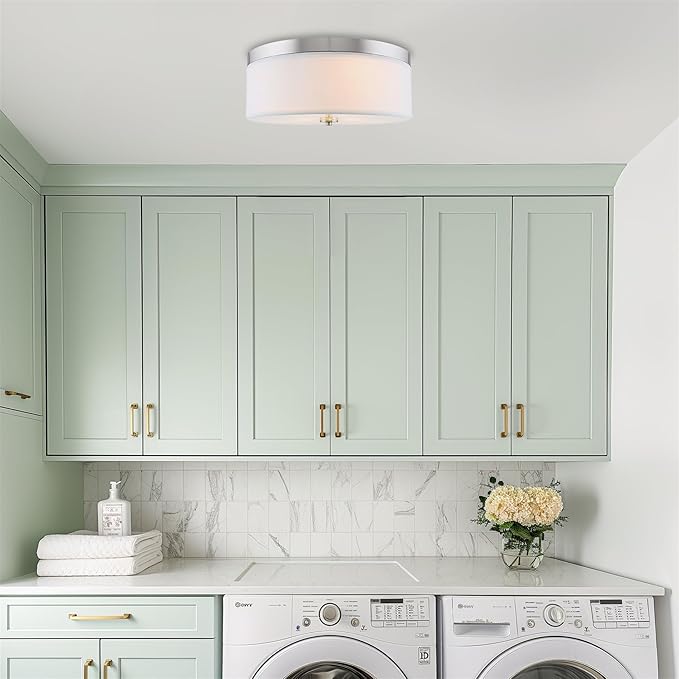 - [LOW-PROFILE MODERN DESIGN] The transitional drum ceiling light showcases a simple, modern design, featuring a classic silver / brushed nickel finish and high quality white linen fabric drum shade. Complemented with a frosted white tempered glass diffuser, this close to ceiling light is easy on the eyes and eliminates glare. This versatile downlight can accommodate any decor, making it a prime choice among interior designers and builders for remodels and new construction projects.