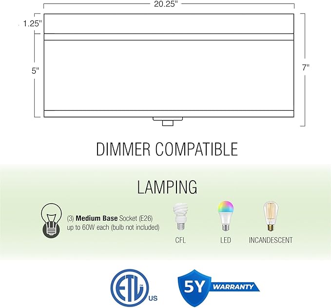 - [ETL LISTED FOR YOUR SAFETY] ETL listed for damp locations. Uses (3) LED, CFL or up to 40W traditional incandescent medium base bulbs. Bulbs sold separately. Includes all hardware for quick installation of this close to ceiling light fixture