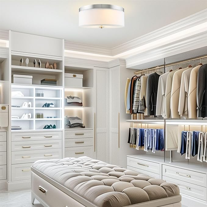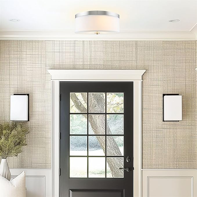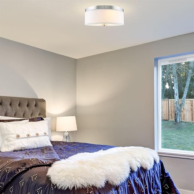 - [LOW-PROFILE MODERN DESIGN] The transitional drum ceiling light showcases a simple, modern design, featuring a classic silver / brushed nickel finish and high quality white linen fabric drum shade. Complemented with a frosted white tempered glass diffuser, this close to ceiling light is easy on the eyes and eliminates glare. This versatile downlight can accommodate any decor, making it a prime choice among interior designers and builders for remodels and new construction projects.