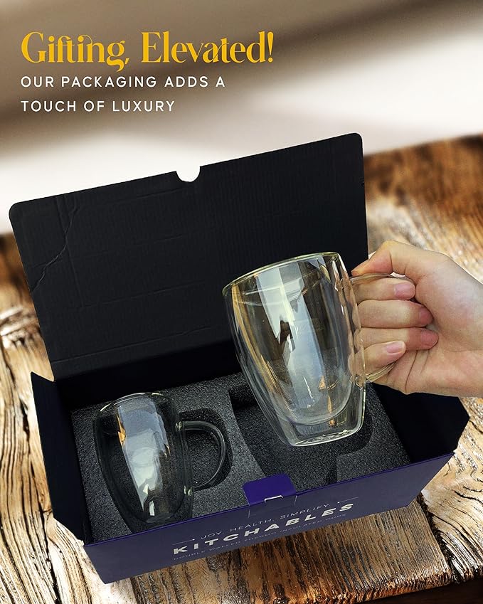 - Won’t Burn Your Fingers - Savor your piping hot drinks with ease immediately after brewing or steeping. Kitchables double walled glass coffee mugs set are crafted using heat transfer-resistant borosilicate glass with ergonomic handles for comfortable drinking.