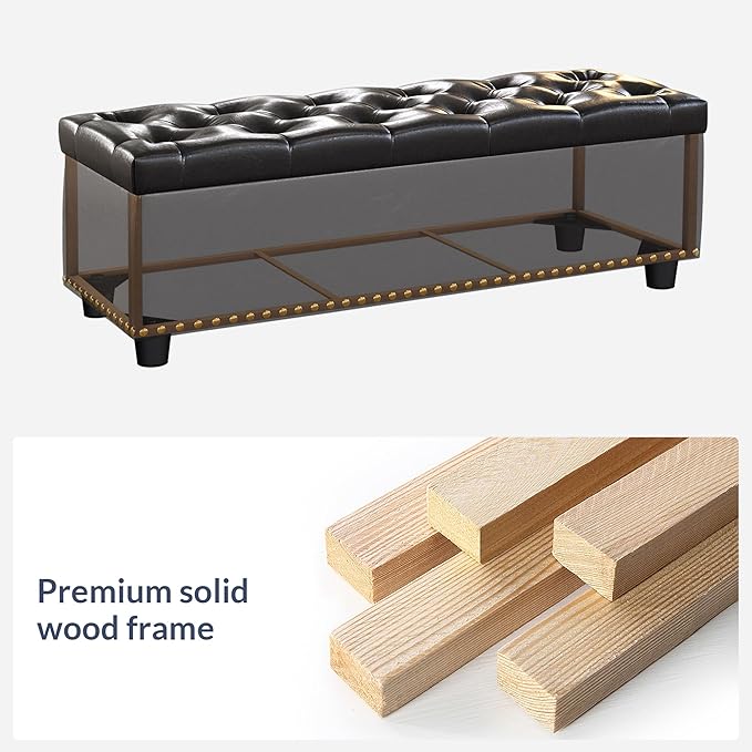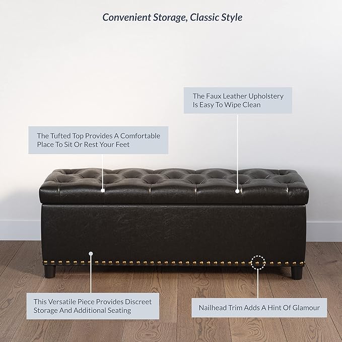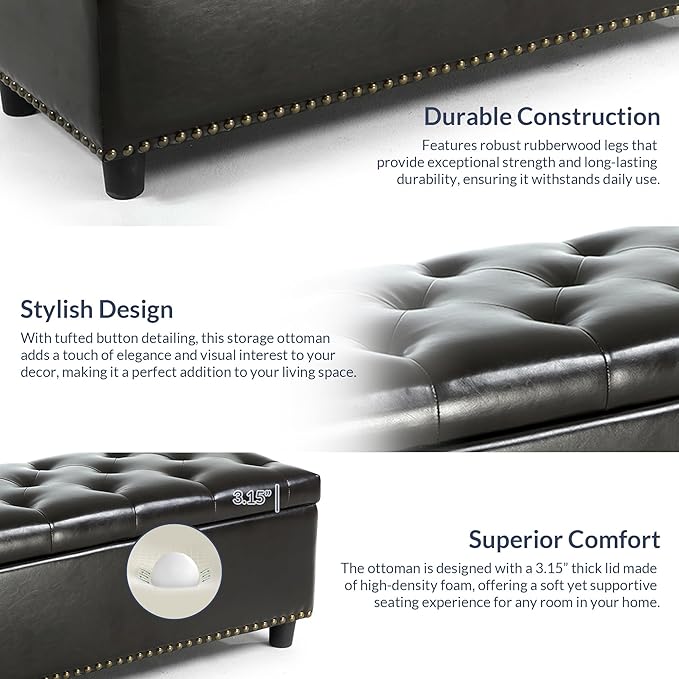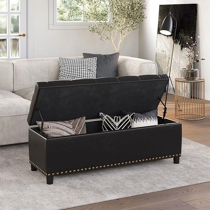 - [UNIQUE LIVING ROOM OTTOMAN] Clean-lined rectangular ottoman with a sleek frame boasts a dapper design that blends classic modern design with a luxurious appeal. Covered with faux leather upholstery with tufted button detailing at the top for an upscale look. A row of gleaming nail head trims at the bottom adds glam accents. Safety hinges ensure the lid remains open until you put away all items, preventing slamming.