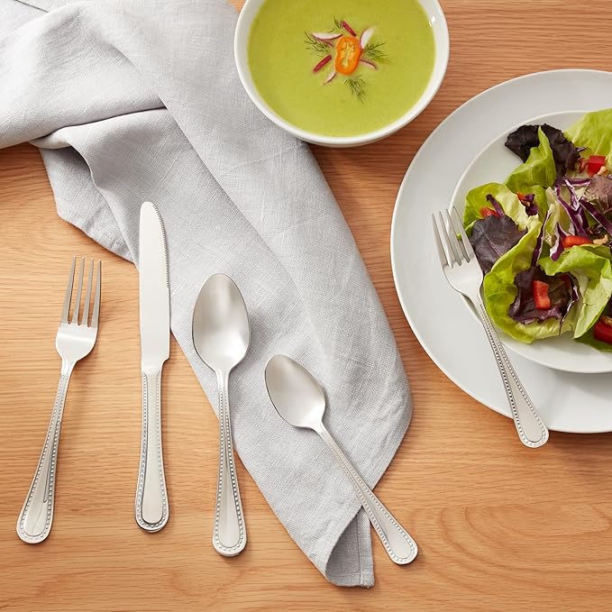 Amazon Basics Silverware Set, Stainless Steel Flatware, Dishwasher Safe, Service for 4, 20-Piece Forks and Spoons, Pearled Edge
