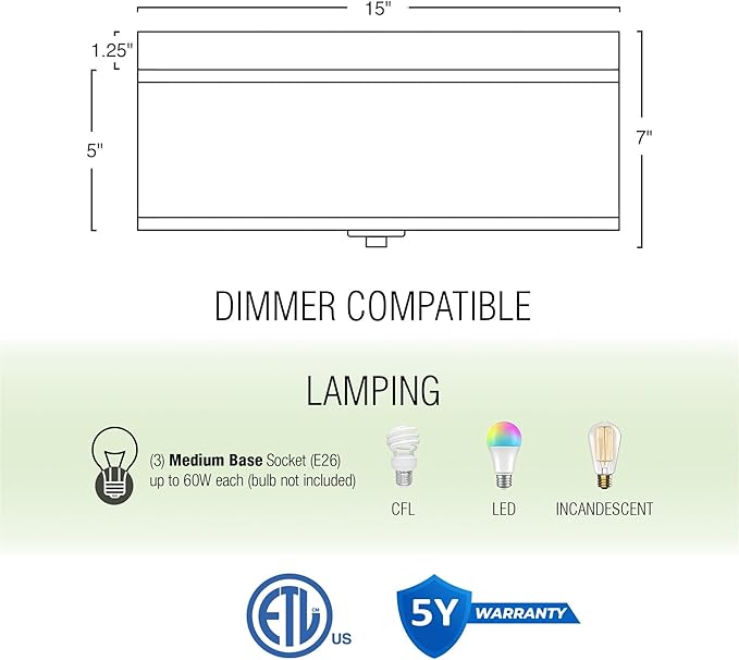 - [ETL LISTED FOR YOUR SAFETY] ETL listed for damp locations. Uses (3) LED, CFL or up to 40W traditional incandescent medium base bulbs. Bulbs sold separately. Includes all hardware for quick installation of this close to ceiling light fixture