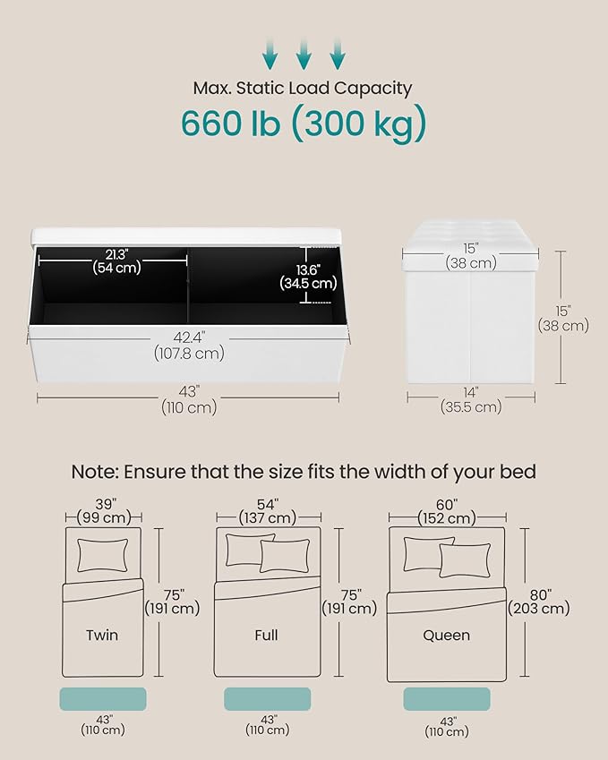 SONGMICS MAZIE Collection - 43 Inches Folding Storage Ottoman Bench, Ottoman with Storage, Foot Rest Stool, Load 660 lb, for Living Room, Synthetic Leather, White ULSF702