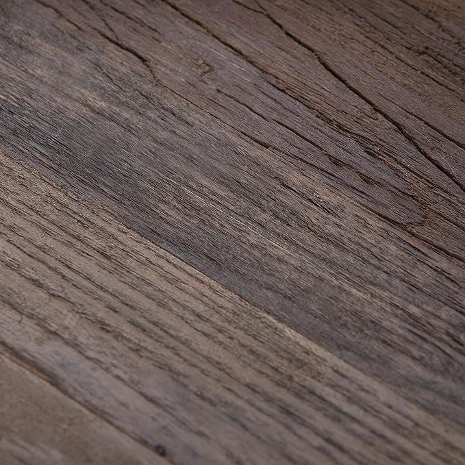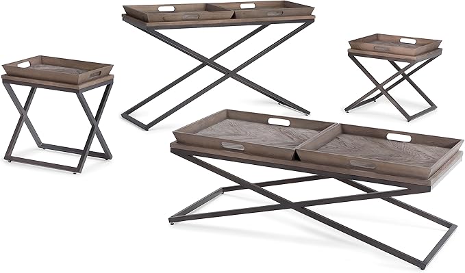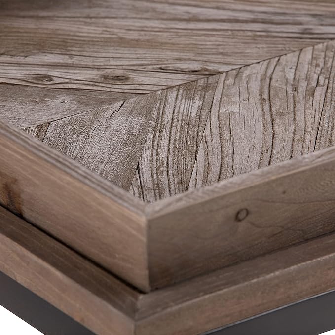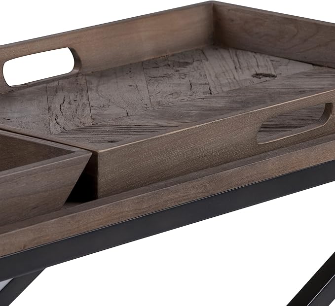 - Features distressed elm wood removable tray and graphite grey metal frame and X design base