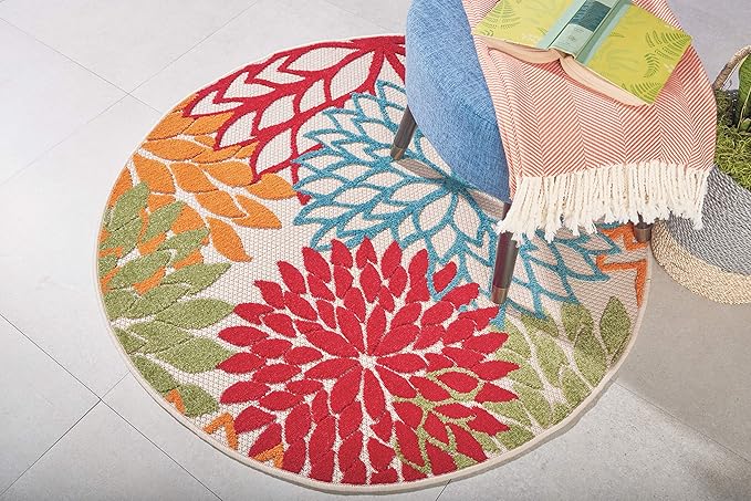 Nourison Aloha Indoor/Outdoor Green 4' x Round Area-Rug, Tropical, Botanical, Easy-Cleaning, Non Shedding, Bed Room, Living Room, Dining Room, Deck, Backyard, Patio (4 Round)