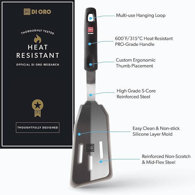 - FORGED WITH 100% PROFESSIONAL GRADE FOOD SAFE SILICONE – Our BPA Free and LFGB Certified non-stick silicone allows for safe and healthy cooking while not compromising on functionality or performance. Like all of our DI ORO products, the Designer Series Slotted Angled Fish Spatula is designed to meet the needs and demanding use of both home cooks and professional chefs.