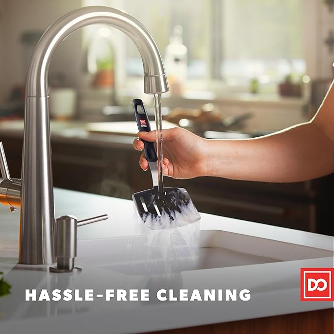 - THE PERFECT COMPLEMENT TO NON-STICK COOKWARE – Whether effortlessly flipping a sirloin steak or sautéing a medley of summer vegetables, the Wide Slotted Spatula is the perfect complement to your expensive non-stick and coated cookware as it will not scratch it. This ergonomically designed spatula is easy-to-clean, dishwasher safe, and will make a wonderful addition to your kitchen.