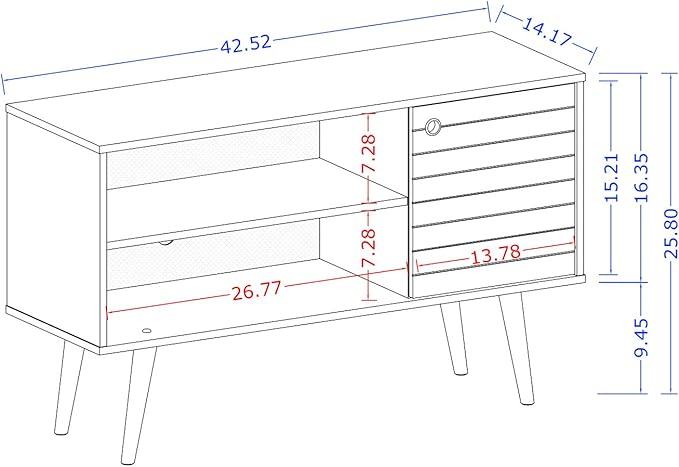 - SMALL ENTERTAINMENT CENTER: This media console measures 42.52" L x 25.8" H x 14.17" D and accommodates a 32"–46" TV. The compact size and handy storage nooks and shelves let you maximize your space. Our small TV stand will fit perfectly in your living room or bedroom.