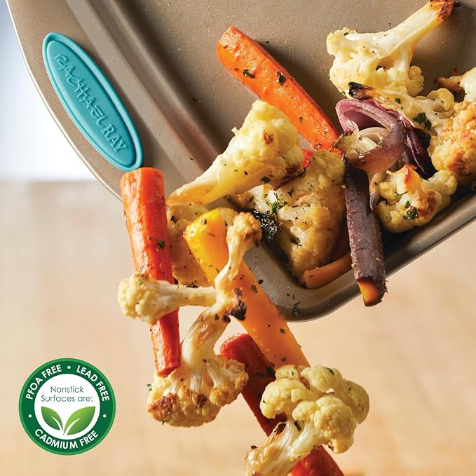 - PREMIUM NONSTICK BAKEWARE: Long-lasting, nonstick provides great food release with quick cleanup; colorful silicone handle grips on the cookie sheet provide comfortable handhold