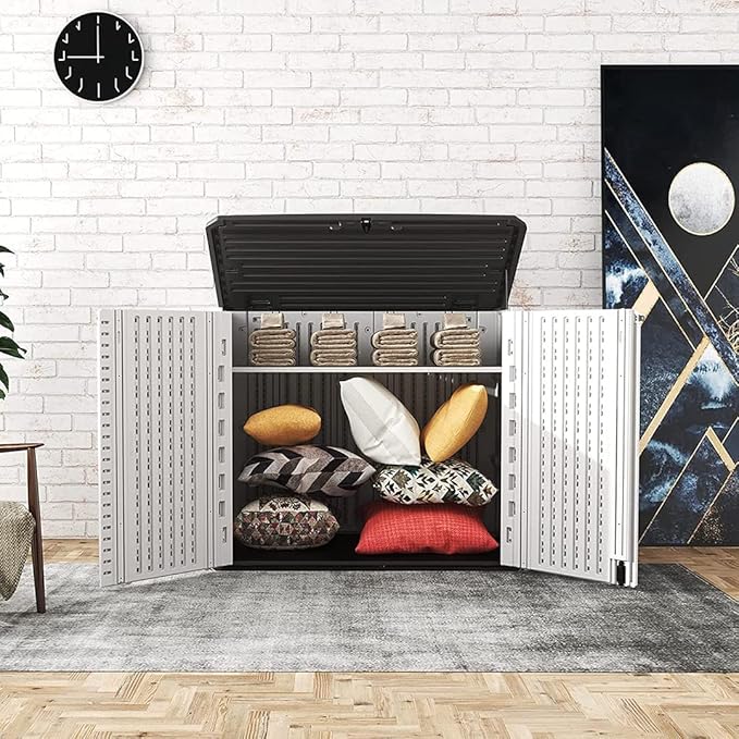 KINYING Outdoor Storage Shed - Horizontal Storage Box Waterproof for Garden, Patios, Backyards, Multi-Opening Door for Easy Storage of Bike, Garbage Cans, Tools, Lawn Mower, Off-White, 26 Cubic Feet