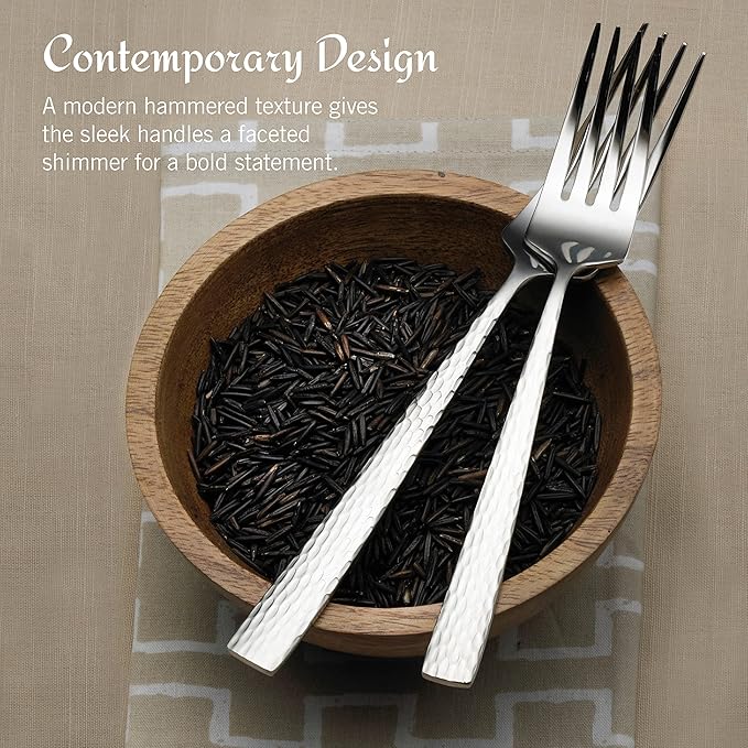 - CONTEMPORARY DESIGN: A modern hammered texture gives the sleek handles a faceted shimmer that will make a bold statement at every dining occasion.
