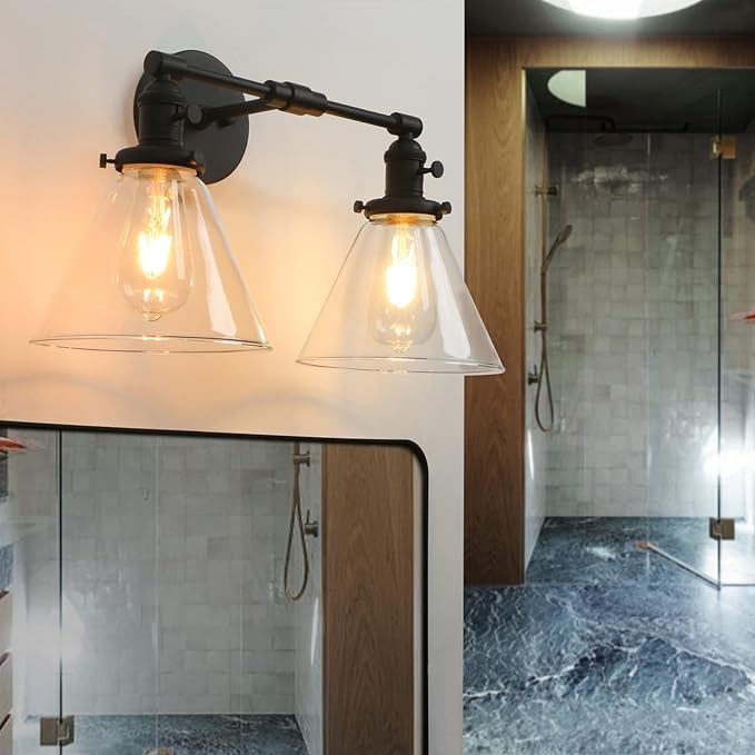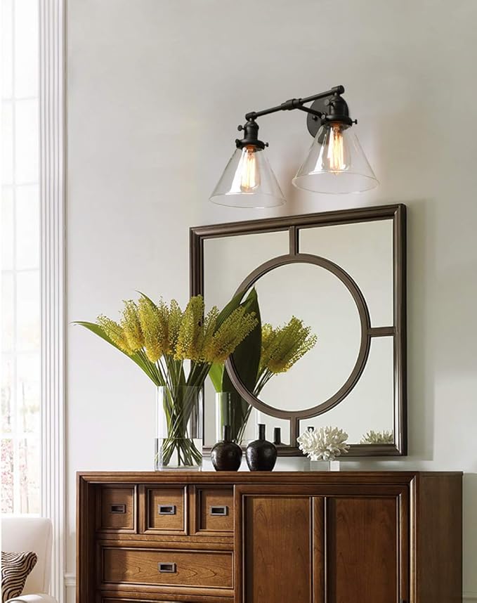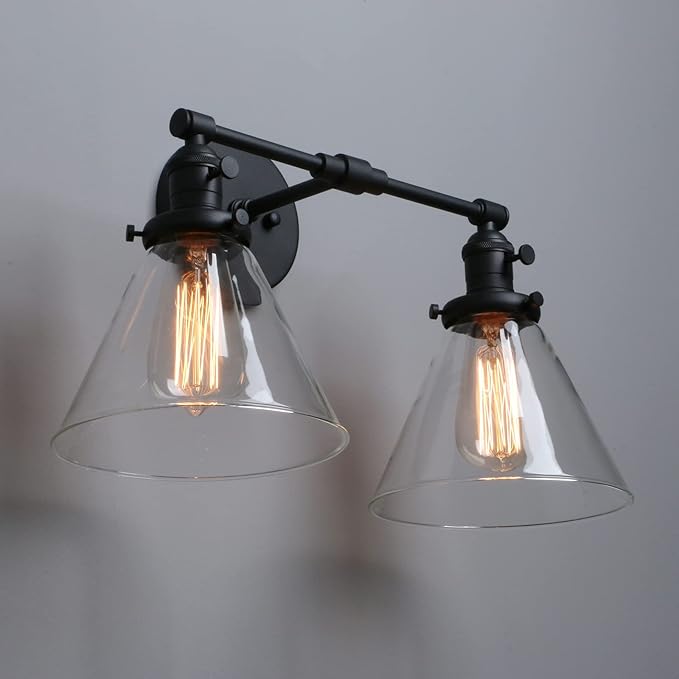 Phansthy 2-Light Industrial Wall Light Black Wall Sconce Light Fixture with Dual 7.3 Inches Cone Clear Glass Canopy(Black)
