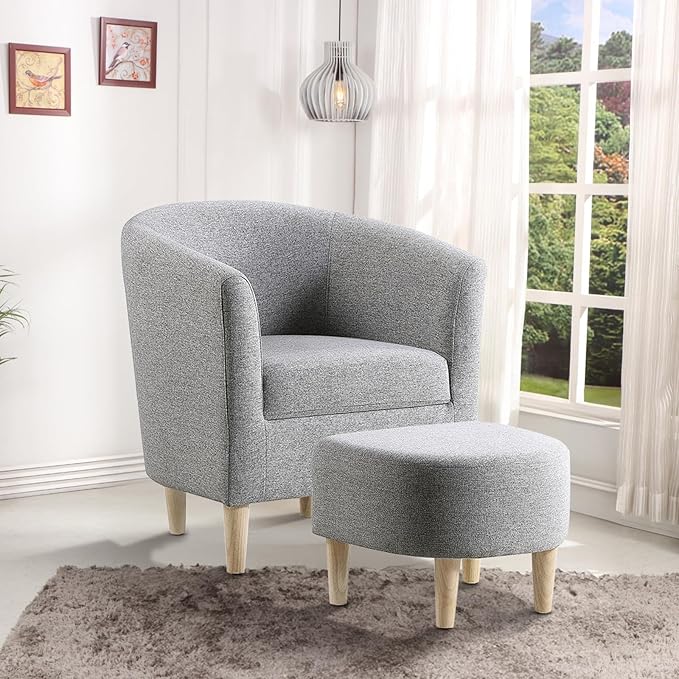 - DAZONE Modern Barrel Chair with Ottoman – Designed for Small Spaces: Add comfort and modern charm to any corner with the DAZONE grey barrel chair and ottoman. Upholstered in breathable linen and crafted with a sleek tub silhouette, this accent chair with ottoman enhances any small apartment, bedroom, reading nook, or home office