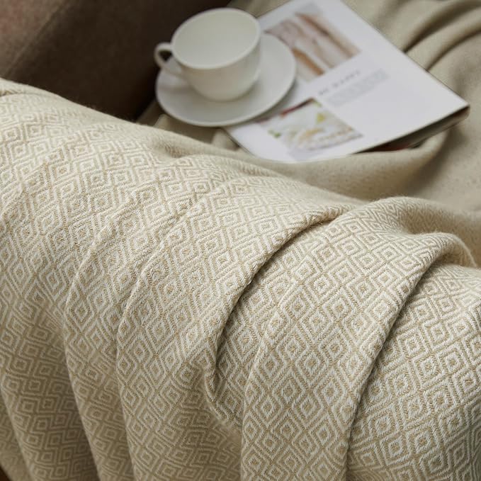 BOURINA Throw Blanket Decorative Faux Cashmere Fringe Lightweight Throw Soft Cozy for Bed or Sofa Outdoor Blanket, 50" x 60" Light Beige