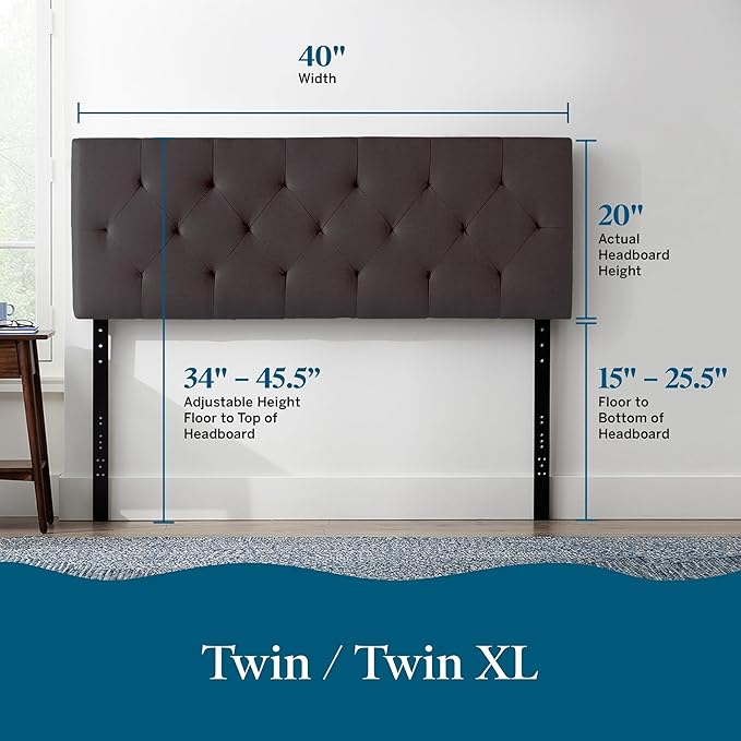 Lucid Mid-Rise Upholstered Headboard - Diamond Tufted - Padded Polyester - Adjustable Height from 34” to 46” - Easy Assembly - Bed Frame or Wall Mount - Sturdy - Charcoal - Twin / Twin XL Size