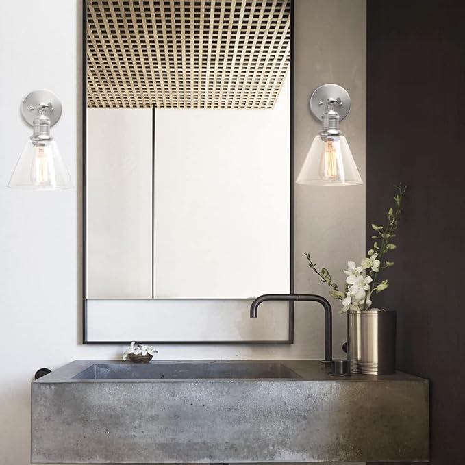Yosoan Indoor Wall Sconce Fixture Light, 1-Light Modern Single Brass Vintage Industrial Hardwired with Funnel Flared Clear Glass Shade Lamp for Bathroom Sink Porch Kitchen Living Room(Brushed)