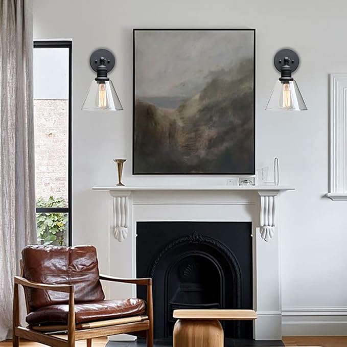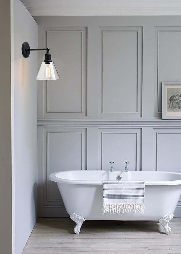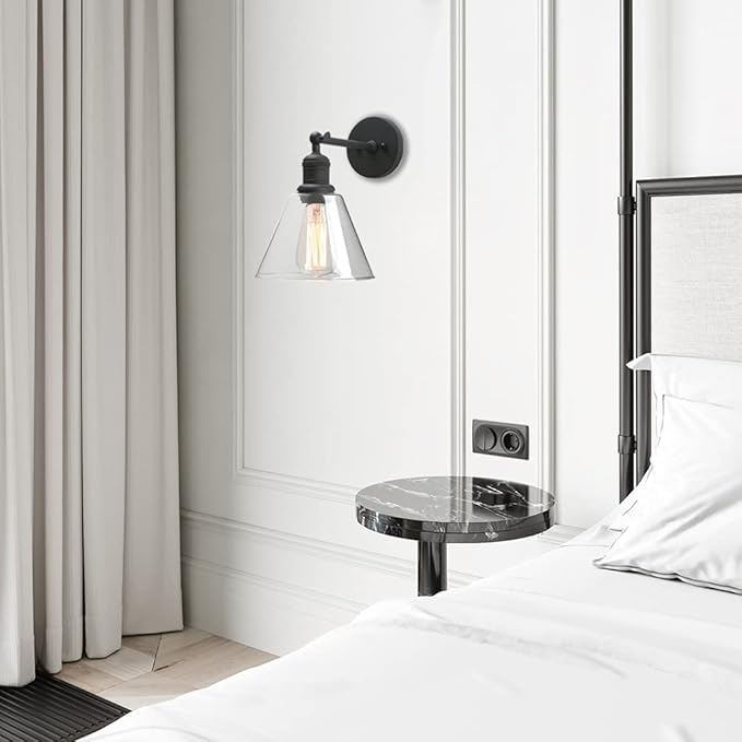 Yosoan Indoor Wall Sconce Fixture Light, 1-Light Modern Single Brass Vintage Industrial Hardwired with Funnel Flared Clear Glass Shade Lamp for Bathroom Sink Porch Kitchen Living Room(Black)