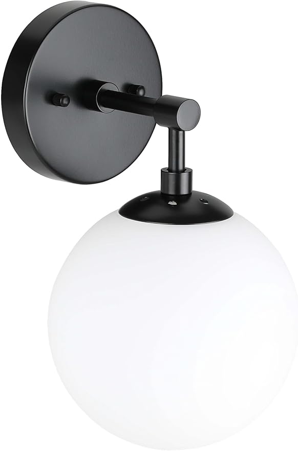 - FEATURE: Hardwired, Matte Black bathroom vanity lighting fixture with white globe glass shade; Single wall sconce is with simple design and easy to install