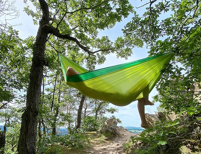 - DURABLE & BREATHABLE MATERIAL: Made from high-quality parachute silk, this travel hammock swing is both durable and quick-drying. The breathable nylon fabric ensures comfort during any outdoor adventure, whether you're camping or backpacking.