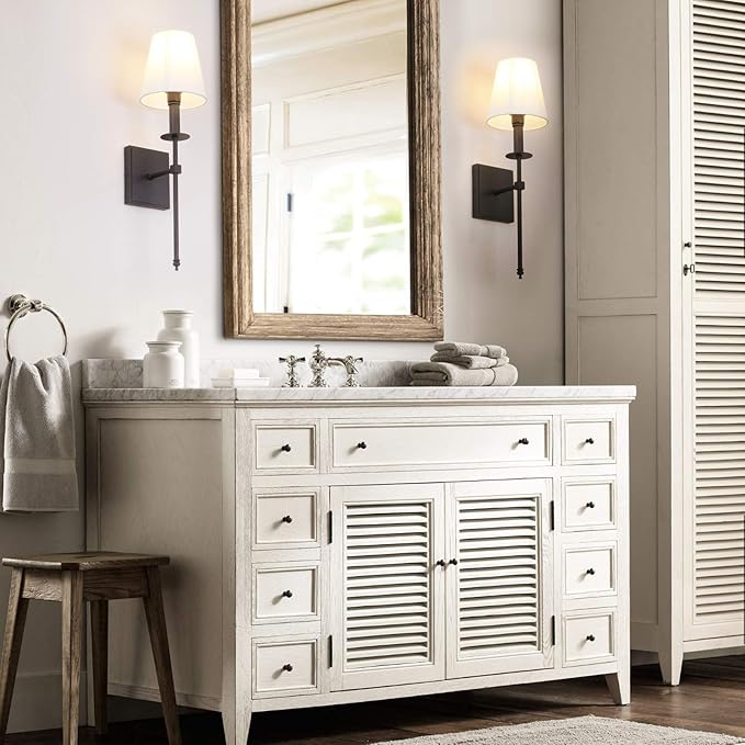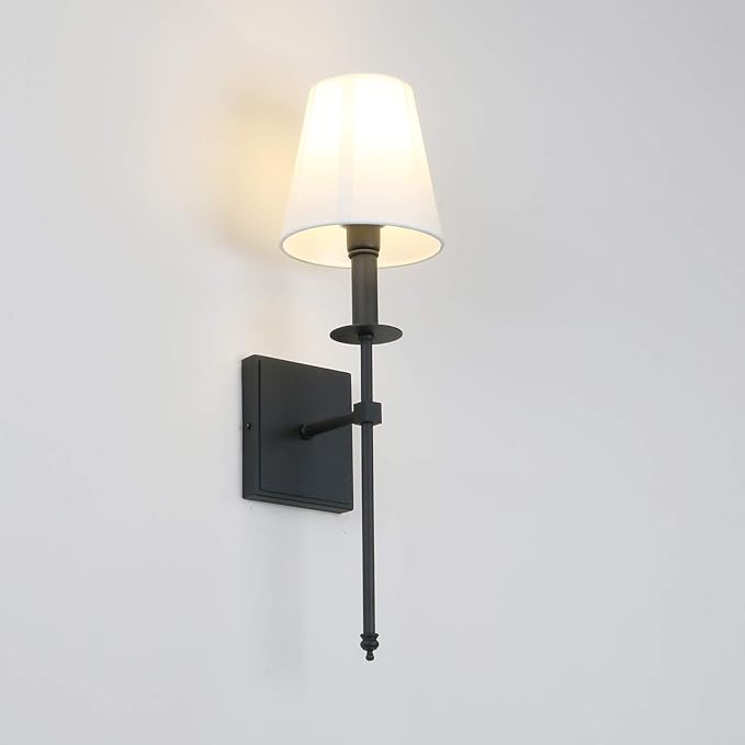 - [Widely Application] Featured a simply elegant arm and a white fabric shade in mid-century style, bathroom sconce is infusing soften lighting in all directions also is a beautiful artmestic decoration for all kinds of places, like living room, dining room, kitchen, farmhouse, reading room, hallway, stairwell, bedside, bedroom, reading room and office.