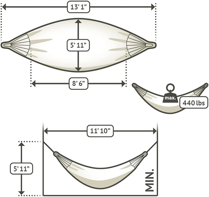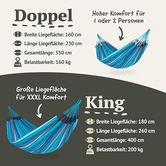 - Ideal Sizes: Double for 355 lbs capacity; King for 440 lbs, perfect hammock for 2 persons.