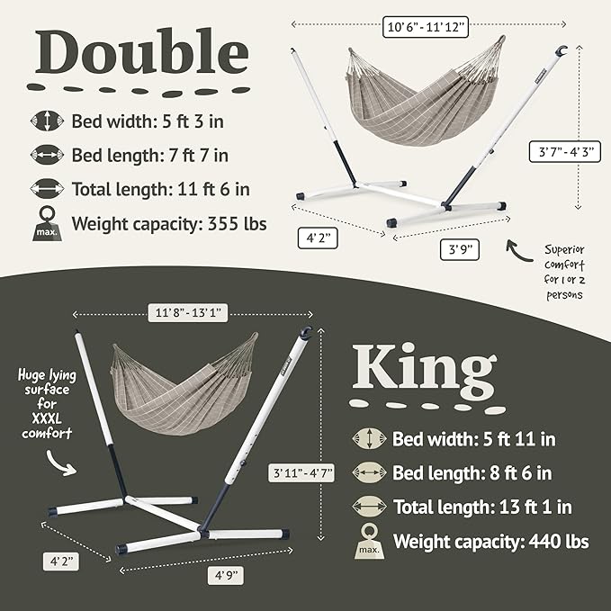 - PICK YOUR PERFECT SIZE: double- Weight capacity 355 lbs, bed width 5 ft 3 in, cloth length 7 ft 7 in, total length 11 ft 6 in; King- Weight capacity 440 lbs, bed width 5 ft 11 in, cloth length 8 ft 6 in, total length 13 ft 1 in