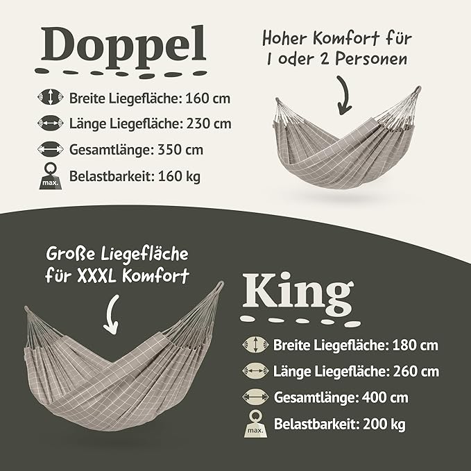 - Ideal Sizes: Double for 355 lbs capacity; King for 440 lbs, perfect hammock for 2 persons.