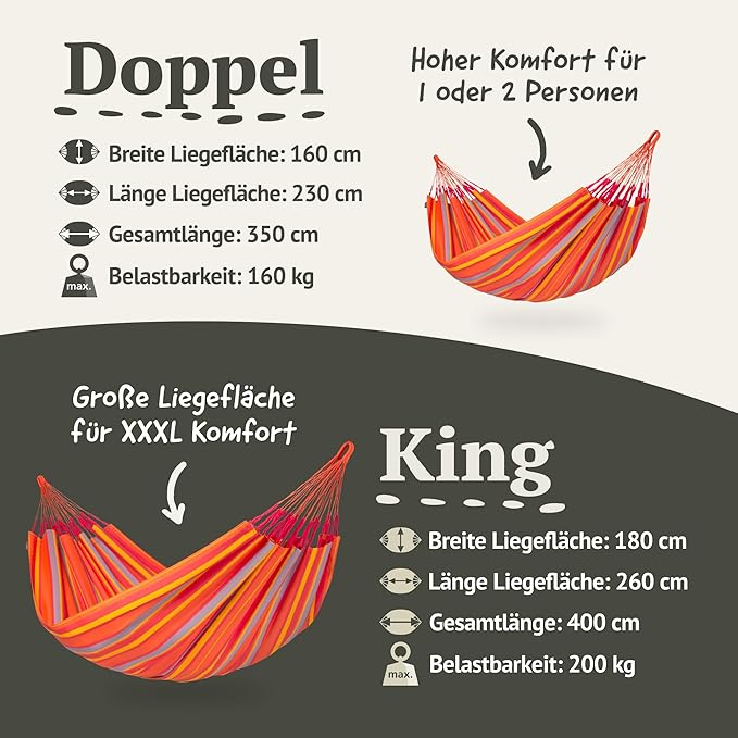 - Ideal Sizes: Double for 355 lbs capacity; King for 440 lbs, perfect hammock for 2 persons.