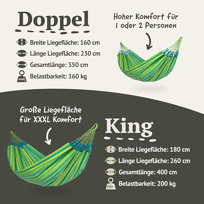 - Ideal Sizes: Double for 355 lbs capacity; King for 440 lbs, perfect hammock for 2 persons.
