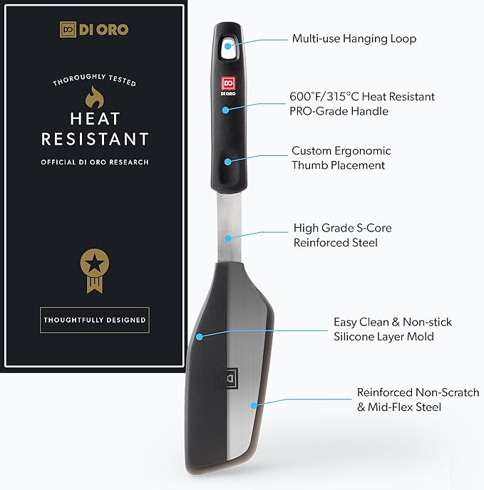 - FORGED WITH 100% PROFESSIONAL GRADE FOOD SAFE SILICONE – Our food grade, BPA Free, and LFGB Certified non-stick silicone allows for safe and healthy cooking while not compromising on functionality or performance. Like all of our DI ORO products, the Designer Series Omelet Spatula is designed to meet the needs and demanding use of both home cooks and professional chefs.