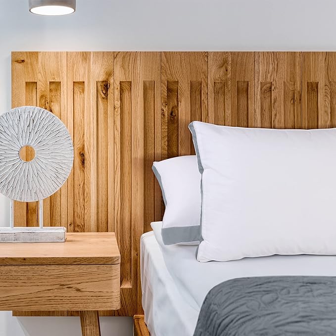 - Gusset Bed Pillows – Set of 2 grey gusset bed pillows with white piping and double stitching that gives a sophisticated look to the pillows and also improves durability