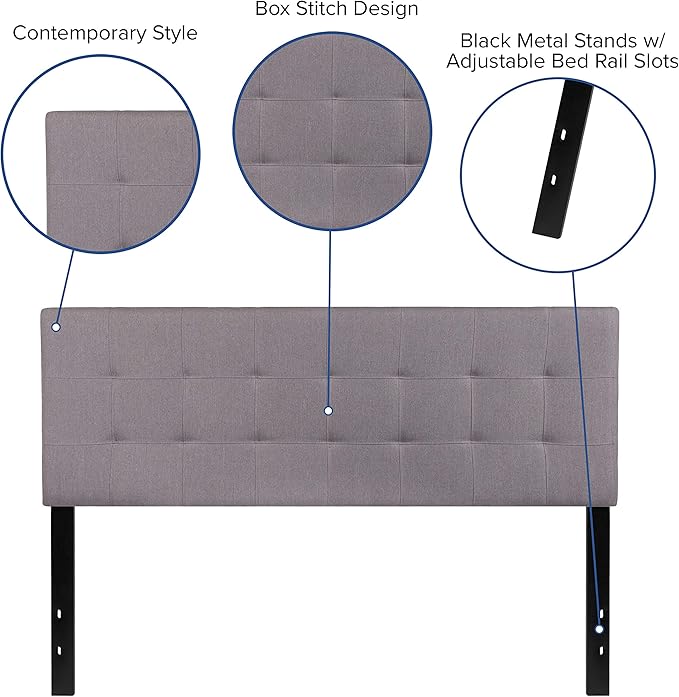 - Light gray fabric upholstered panel headboard, Headboard Size: 61.5"W x 3"D x 24"H