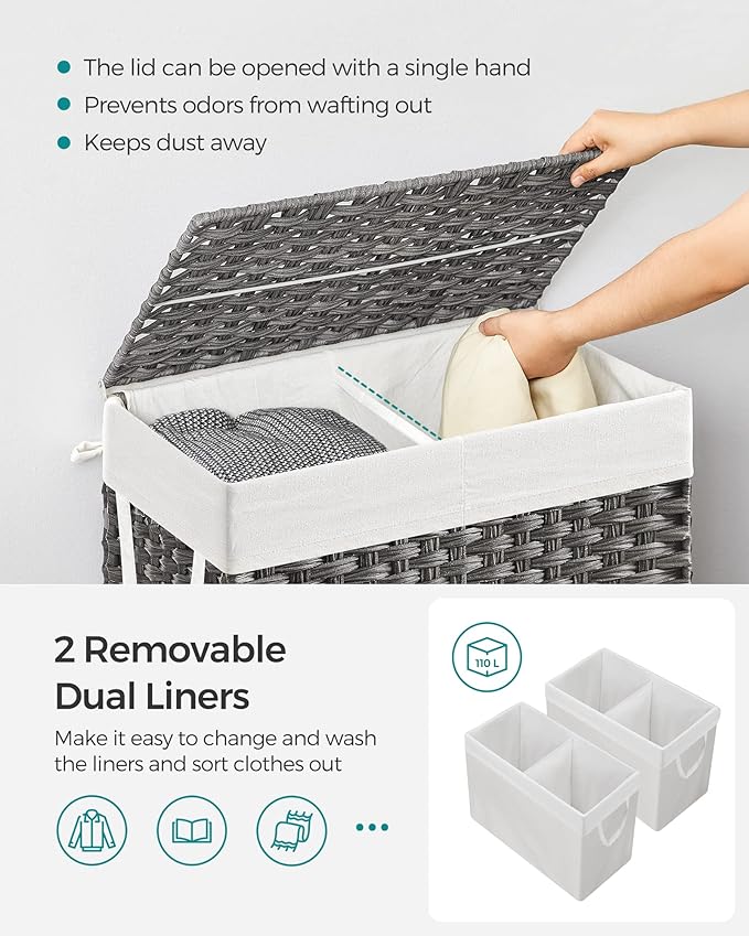 SONGMICS Laundry Hamper with Lid, 110L Clothes Hamper with 2 Removable Liner Bags, 6 Mesh Bags, Wicker Laundry Basket, Double Laundry Hamper for Bathroom, 13 x 22.4 x 23.6 Inches, Gray ULCB52WG