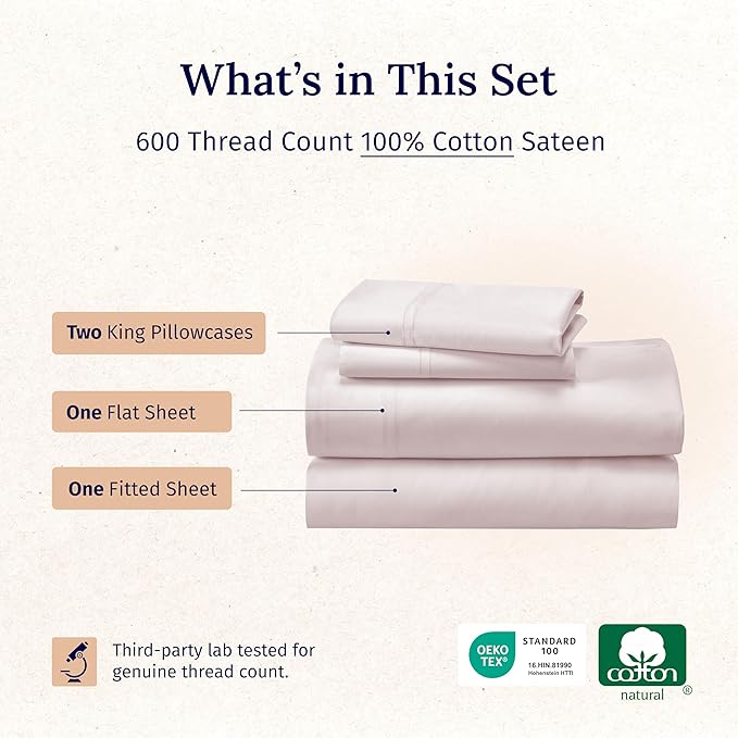 - Luxury Cotton Experience: Enjoy the fresh crispness of our certified 600 thread count sateen 100% cotton sheets, providing a modern and sleek five-star hotel experience in your own bedroom. Our luxury blush pink king cotton sheets set keeps you cool and comfortable in all seasons. Note: These sheets offer a crisp, soft feel, not a silky-soft texture.