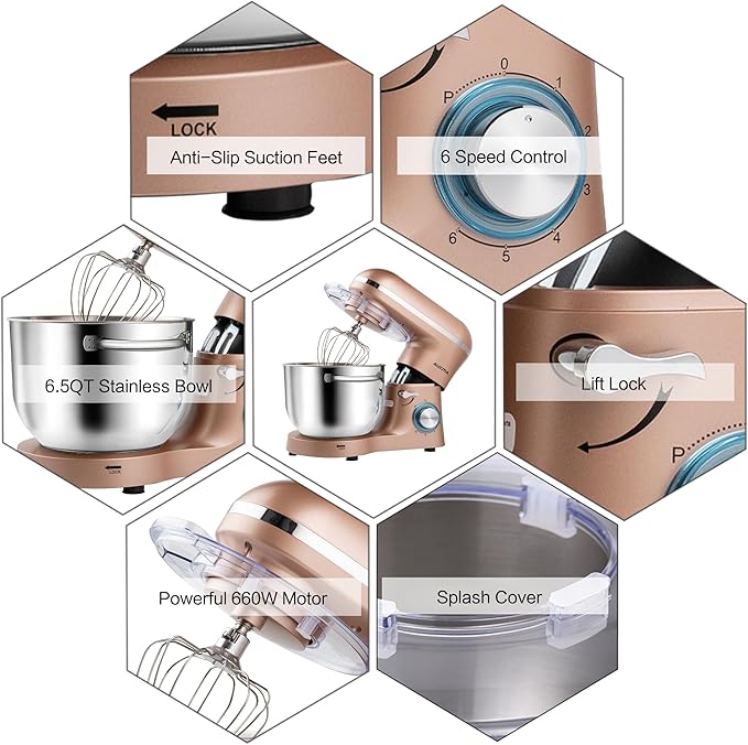 Aucma Stand Mixer,6.5-QT 660W 6-Speed Tilt-Head Food Mixer, Kitchen Electric Mixer with Dough Hook, Wire Whip & Beater (6.5QT, Champagne)