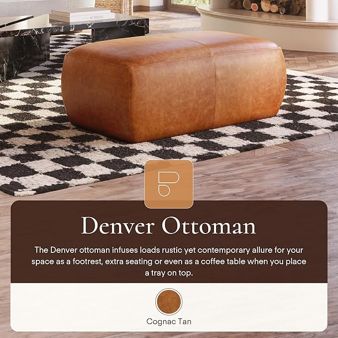 - Make Good Living Gettable: The Denver leather ottoman by Poly & Bark is a premium upholstered ottoman featuring full-grain pure-aniline Italian leather upholstery. This upholstered beige ottoman comes in our timeless Cognac Tan color that highlights the natural beauty of the hide.